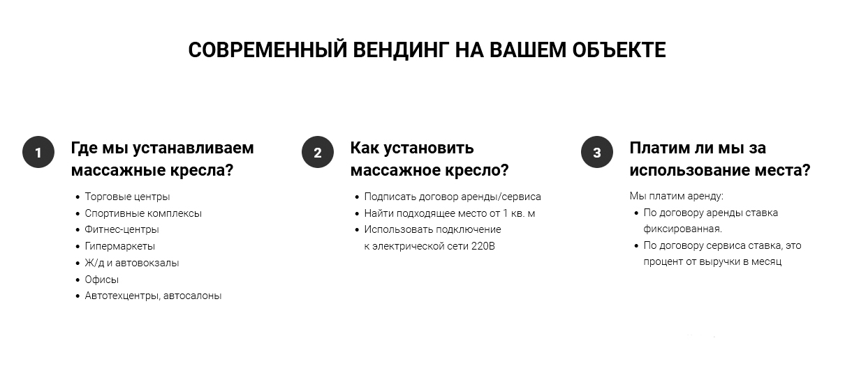 Прекрасное вендинговое кресло по приемлимой цене. Пульс управления встоен в кресло, что очень удобно. Можно оплачивать самртофонов с помощью QR кодов. Есть голосовая напоминалка клиенту об оплате. Очень классная функция нулевой гравитации, очень здорово расслабляет.